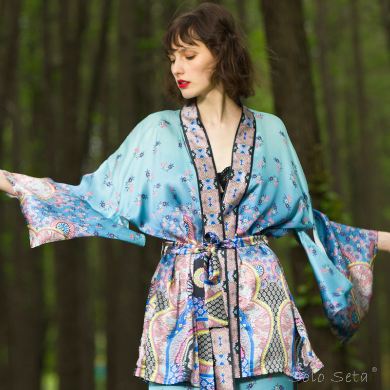 Soloseta真絲睡袍女長袖睡衣可外穿結婚晨袍繫帶日式和風家居服